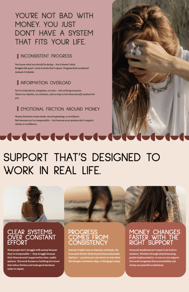 Because her brand was wrapped in warmth and sunset imagery, the copy has to do the heavy lifting. Visitors needed to immediately understand: she is a money coach. Not lifestyle or wellness in the abstract.