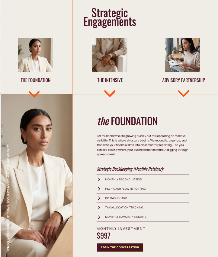 Everything that followed was built to support and deepen that opening. The hero subhead repositioned the service clearly: strategic bookkeeping and profit clarity for growth-stage founders ready to lead with data.